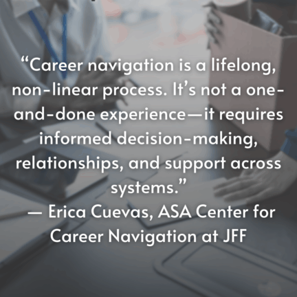 Jobs for the Future (JFF) continues to lead the national conversation on career navigation with the launch of its ASA Center for Career Navigation. In a recent webinar hosted by the Ohio Workforce Coalition, JFF shared insights from its 50-state landscape analysis, which examines how states are building systems to help young people—especially those ages 16 to 24—access the information, guidance, and opportunities they need to pursue meaningful careers.